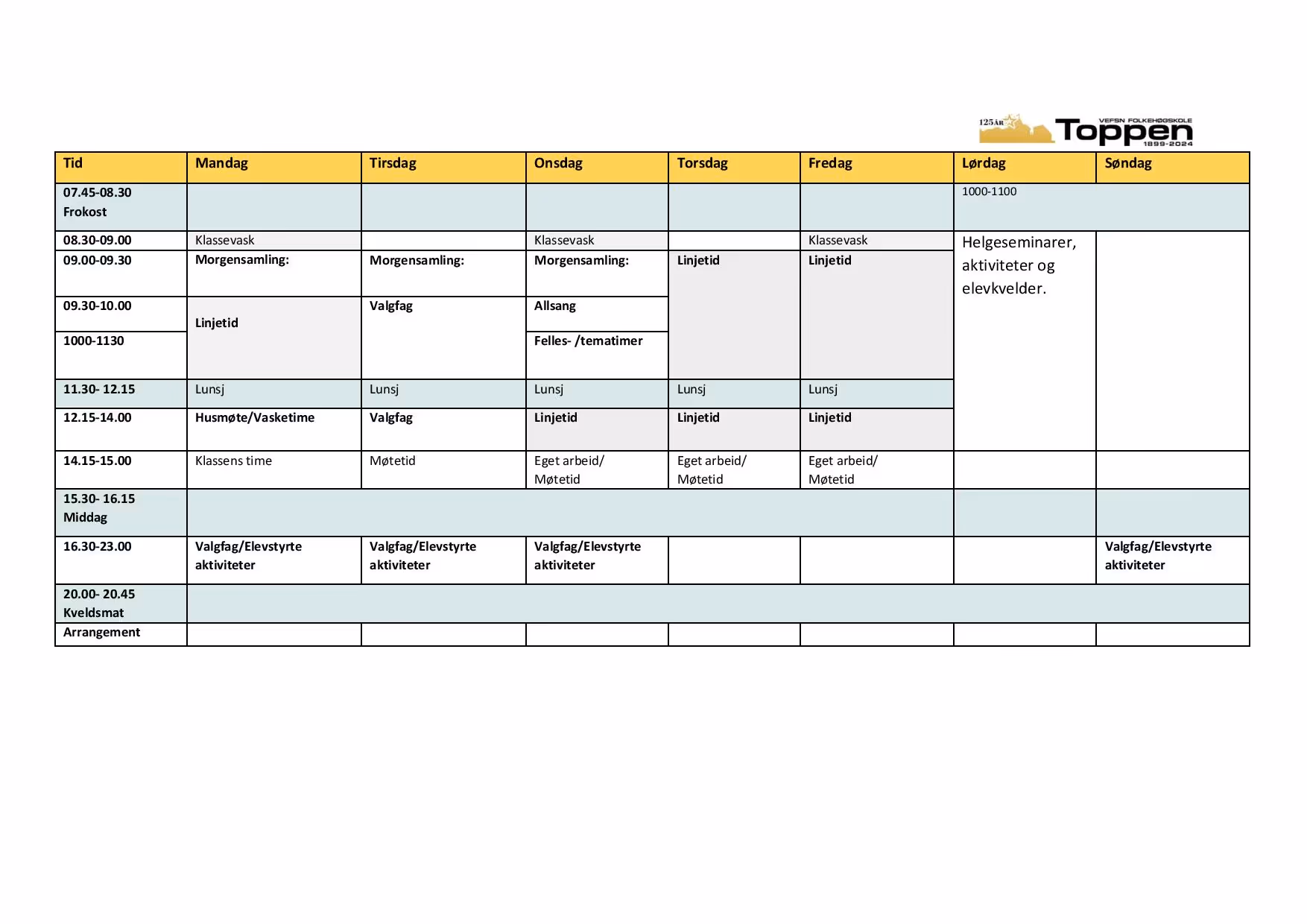 Under ser du hvordan timeplanen ser ut i vanlige uker. Det vil kanskje bli noen justeringer for neste skoleår, men timeforholdet vil være det samme. De fleste valgfag foregår på ettermiddag/ kveld. En del linjeaktivitet forutsetter også jobbing på kveldstid. Vi detaljplanlegger året i perioder, noe som vil medføre noen endringer i planen gjennom året.